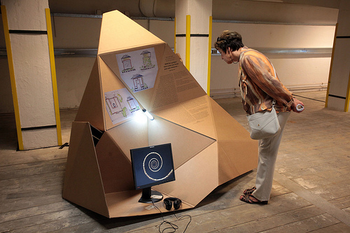 Im „Papplab“ nebenan wird erprobt, wie man ein ganzes Festival mit billigen, umweltfreundlichen und ziemlich gut aussehenden Pappmöbeln ausstatten kann.