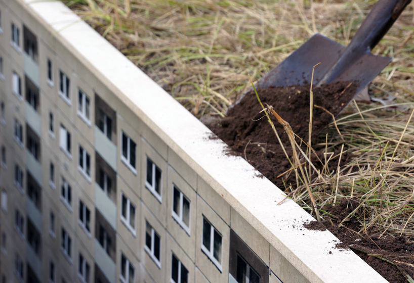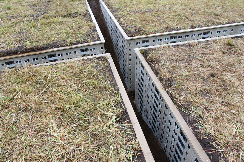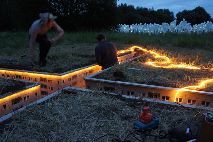 Welch eine schöne Vorstellung. Wenn man über einer Stadt schweben würde und nur grün sieht, weil jedes Dach mit Wiesen, Blumen und Bäumen bepflanzt ist. In diesem Fall ist es zunächst eine modellhafte Arbeit des Berliner Künstlers EVOL, der die Miniatur-Stadt unter der Wiese im Rahmen ms dockville Kunst und Musik Festivals erschaffen hat. Acht Tage wurde an der Umsetzung des Projekts gearbeitet und wird mindestens bis zum Ende des Festivals dem 14. August zu bestaunen sein.