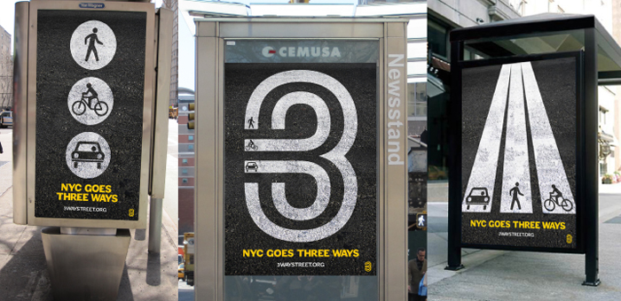 Für Seine Abschlussarbeit an der School of Visual Arts in New York City hat Ron Gabriel eine Kampagne Entwickelt, die sich den drei Mobilitäts-Arten (Fußgänger, Fahrradfahrer, Autos) im Stadtverkehr widmet und den Namen trägt 3-Way Street. Dank einer Kamera in Vogelperspektive werden unzählige lebensgefährliche Situationen zwischen den Verkehrsteilnehmern eingefangen, die auch hätten anders ausgehen können. Auch wenn es sich hier um eine Sammlung von Extremsituationen handelt, wird schnell deutlich, dass enormer Verbesserungsbedarf in der Organisation des Straßenverkehrs bzw der verschiedenen Teilnehmer vorliegt.