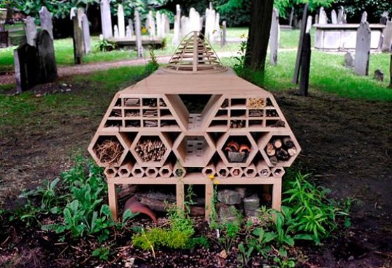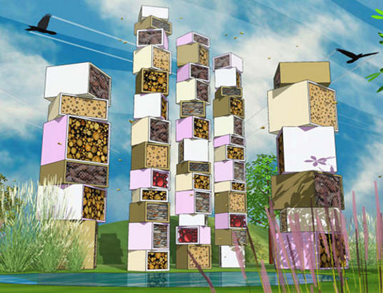 Ein vor einigen Monaten ausgelobter Wettbewerb „Beyond the Hive“ in London hat sich dieser Problematik angenommen und Architekten und Designer aufgerufen, ihre Ideen zu einem künstlich angelegten Lebensraum – einem Hotel für Insekten aller Art zu präsentieren. Vorgabe dabei war, dass für alle Entwürfe nur recycelte oder nachwachsende Materialien verwendet werden sollen, die in der Stadt oder in ihrer unmittelbarer Umgebung zu finden sind.