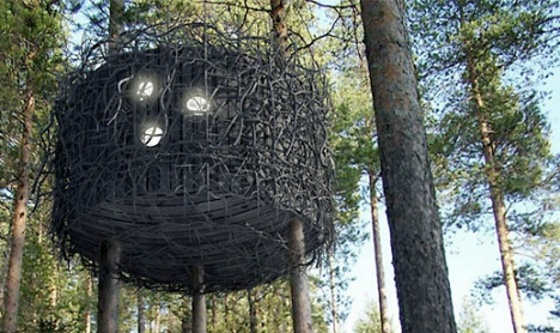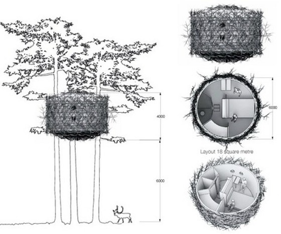In sechs Meter Höhe haben die schrägen Vögel der Gattung Homo sapiens ein überdimensioniertes Vogelnest gebaut, welches aufgrund mangelnder Flugfertigkeiten über eine einfahrbare Treppe zu erreichen ist. Auf 18m² bietet es Platz für eine Familie mit 2 Kücken… äh Kindern. Trotz des naturnahen Erscheinungsbildes muss auf Komfort nicht verzichtet werden. Die Innenräume wurden bewußt modern eingerichtet und besitzen natürlich auch ein WC und Waschmöglichkeiten.
