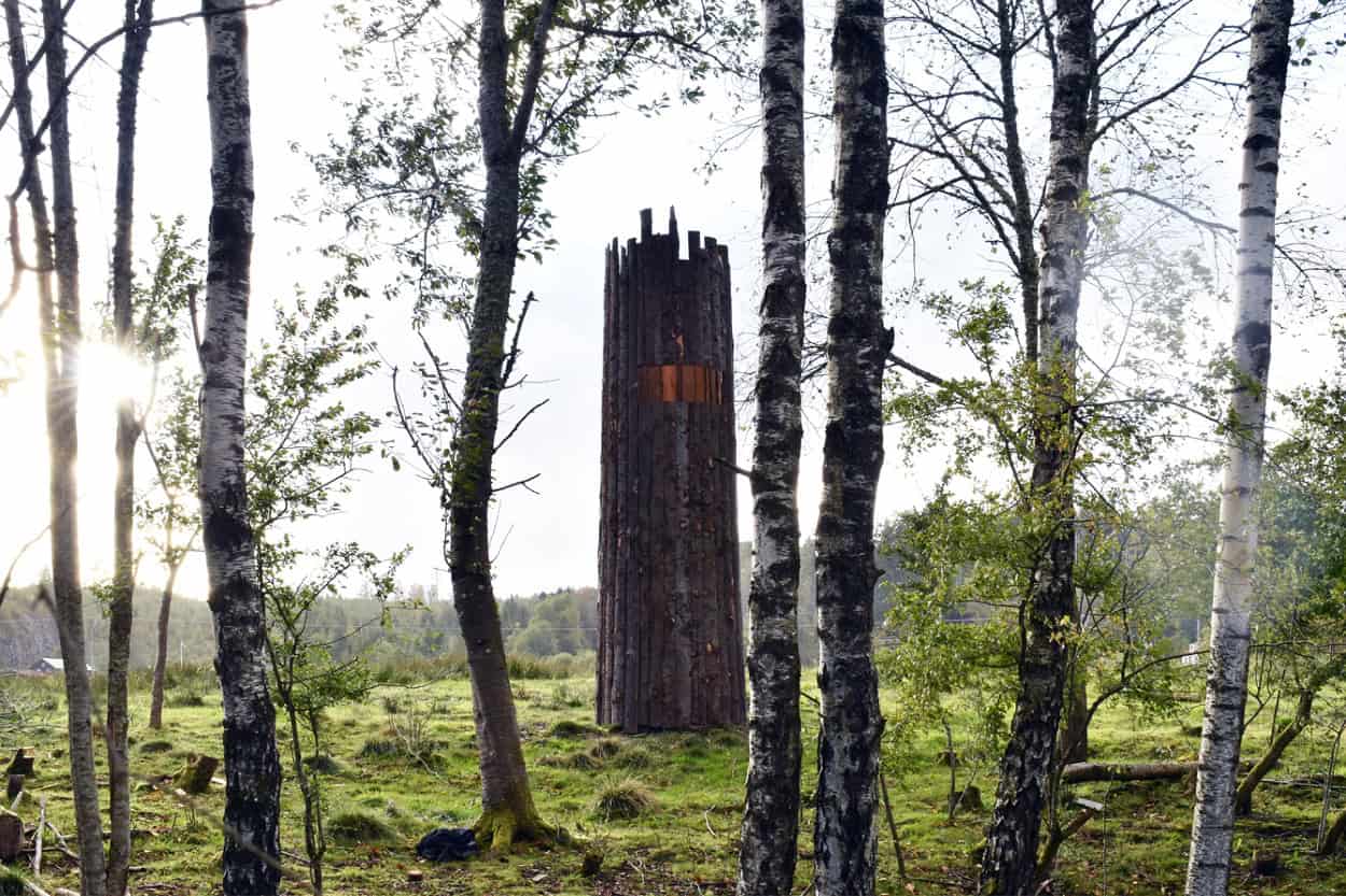 Diese Reststücke setzte Mejergren vertikal aneinander, leicht überlappend, bis sie sich zu einem runden Turm schlossen. Entstanden ist eine Skulptur aus Holz, die aussieht, als sei sie selbst ein Baum, ein Riese, der mitten aus dem Boden wächst. Von Weitem könnte man glauben, es handle sich um einen uralten Stamm. Erst beim Näherkommen erkennt man den Eingang, der ins Innere führt.