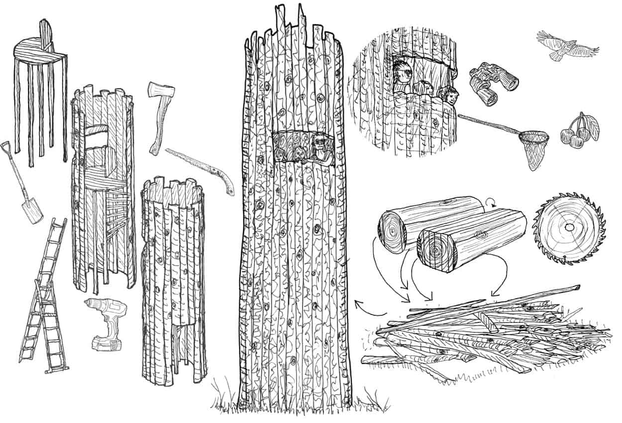 Wer den Turm sieht, spürt sofort seine stille Kraft. Überraschend, wie selbstverständlich er in der Landschaft steht, als wäre er schon immer da gewesen. Der kleine Turm wirkt auf den ersten Blick wie ein mächtiger Baumstamm, der sich organisch in die Umgebung fügt. Eine einfache Idee, und doch so stimmig. Die durchgesägten Stämme erzählen vom Kreislauf: vom Fallen, vom Neubeginn, vom Weiterleben in anderer Form. Genau darin liegt die Schönheit dieses Projekts, es ist schlicht, aber sinnlich, fast meditativ.