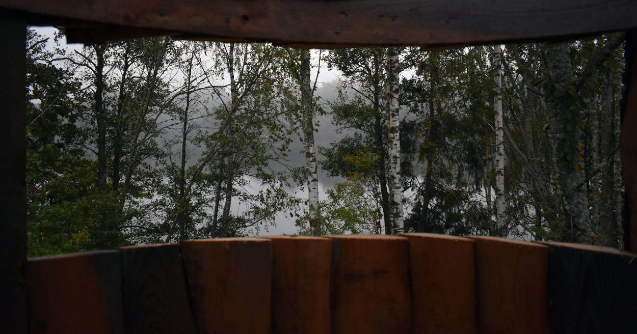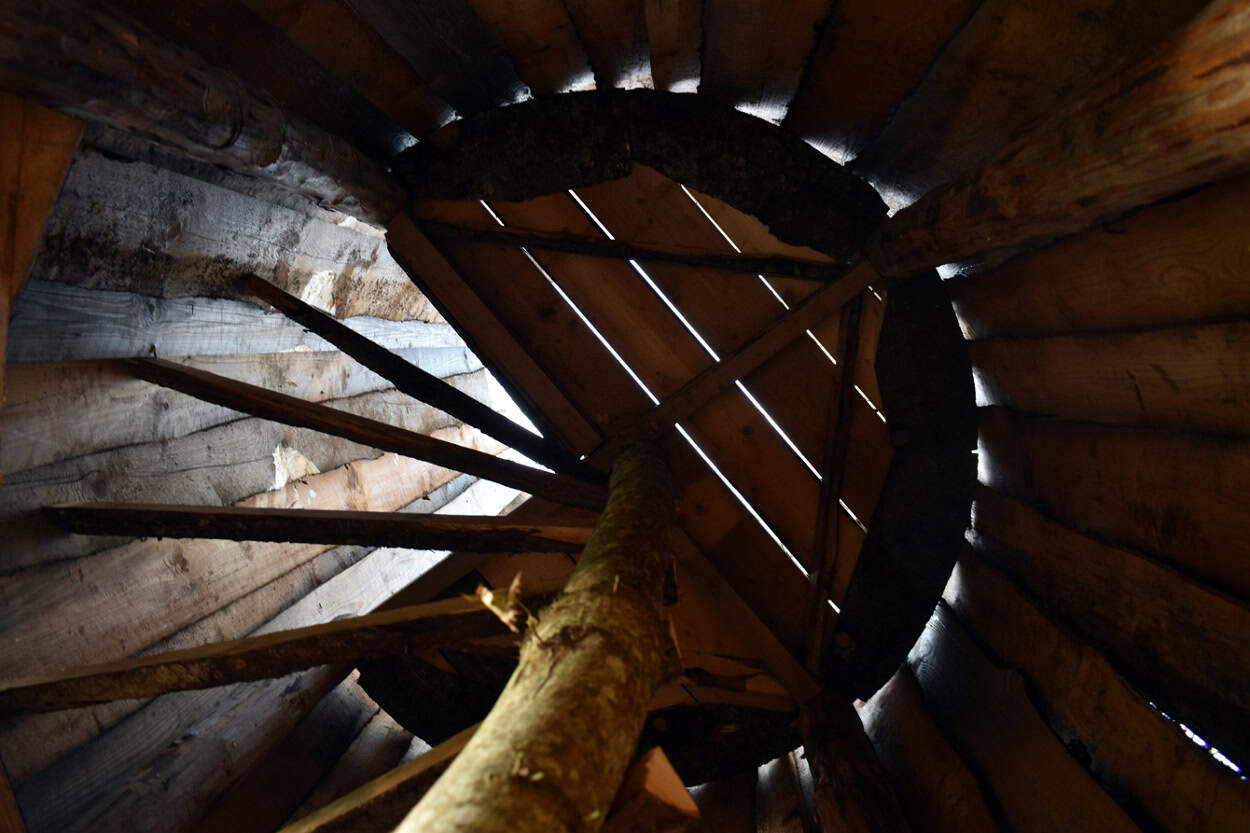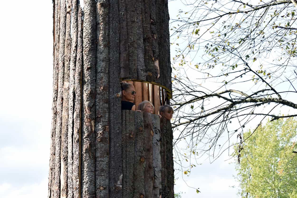 Diese Reststücke setzte Mejergren vertikal aneinander, leicht überlappend, bis sie sich zu einem runden Turm schlossen. Entstanden ist eine Skulptur aus Holz, die aussieht, als sei sie selbst ein Baum, ein Riese, der mitten aus dem Boden wächst. Von Weitem könnte man glauben, es handle sich um einen uralten Stamm. Erst beim Näherkommen erkennt man den Eingang, der ins Innere führt.