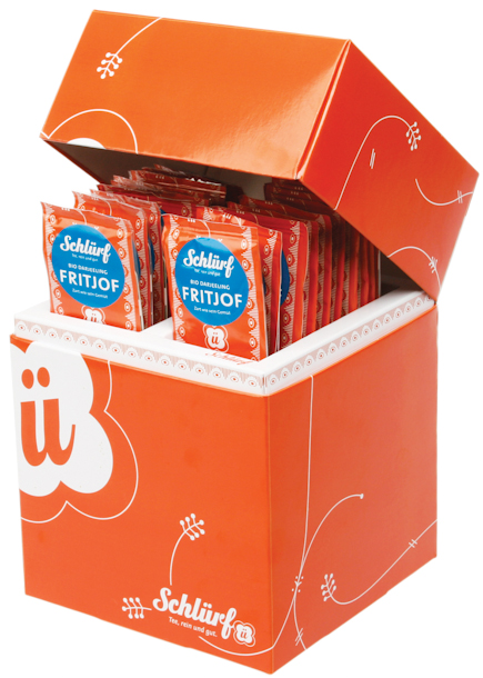 Trotzdem setzt Einfallsraum Verpackungselemente ein, die den Inhalt sinnvoll schützen und aber auch solche, die zum Verschenken dienen. So ist die opulente Schmuckkartonage mit Tee-Einzelportionen so auffällig wie der wiederverschließbare Standbeutel mit losem Tee praktisch ist. Beide Packmittel sind auf unterschiedliche Kundenbedürfnisse und Alltagssituationen ausgelegt, mit mal viel, mal wenig Pomp.  Auch die Namensgebung für die Produkte läuft bei Einfallsraum anders:  die Teesorten bei Schlürf senden keine modischen Heilsversprechen, sondern norddeutsche Namen wie „Ole“ oder „Telse“, deren mutmaßliche Eigenschaften gleich in den Claim mit eingearbeitet sind. So liest man bei Bio-Eistee „Elke“: „Elke – Exotisch wie ihre Augen“.