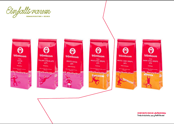 Hier spiegelt sich der Anspruch an das Produkt direkt in der Gestaltung der Verpackung: Bio und fair sind diese Produkte sowieso, also wird auf hohem Qualitätsniveau  und mit viel Sorgfalt gespielt. Man trifft hier ein Design, das sich traut, ausserhalb der ausgetretenen Pfade der Zeichenwelt zu agieren, denn wer sagt zum Beispiel dass Schokoladen-Kommunikation nicht auch pink-lila sein kann – wie bei Blömboom?