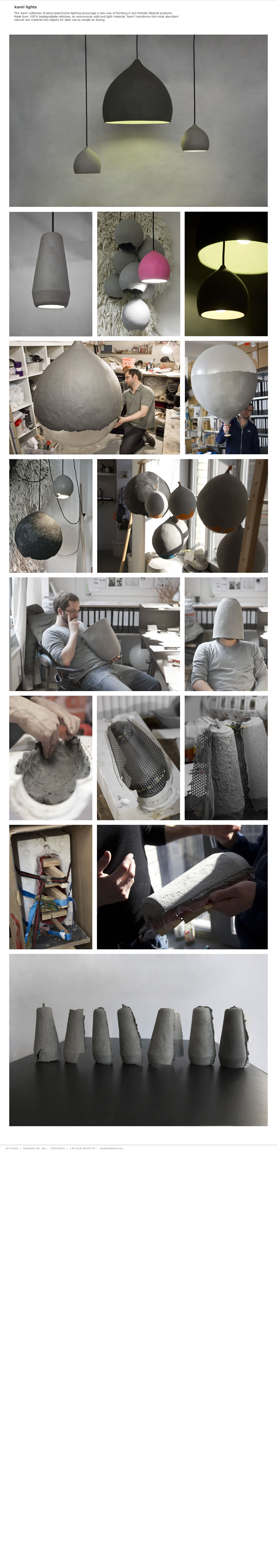 Das Berliner Design-Büro Ett La Benn wurde bereits mit ihrer Lampen-Kollektion Malva hier auf LilliGreen® vorgestellt. Das neue Projekt kami collection besteht aus 100% Zellulose und ist somit ebenfalls 100% kompostierbar. Aus einer Art Pappmaschee entstehen moderne Alltagsobjekte wie Vasen, Schüsseln oder auch Lampenschirme die sich zum einen durch besondere Festigkeit auszeichnen, zum anderen aber auch durch extreme Leichtigkeit auffallen. Nicht so wie bei Ton oder Porzellan reicht ein Trocknen bei Zimmertemperatur aus, um das Material auszuhärten.