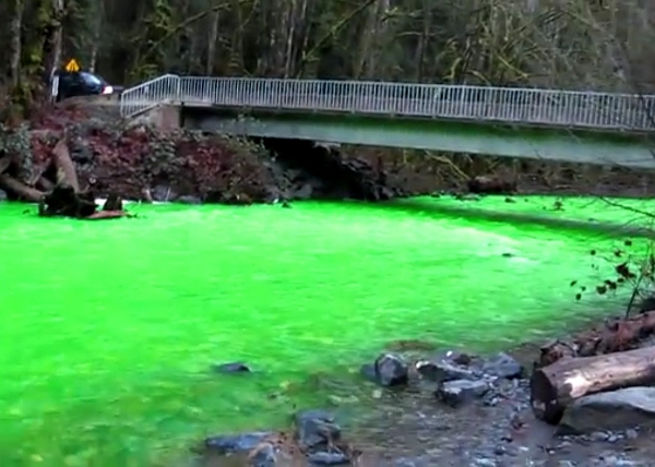 Den Menschen am Goldstream River auf Vancouver Island wurden vor ein paar Tagen sprichwörtlich die Augen geöffnet. Denn aus dem “goldenen Fluss” wurde eine neongrün leuchtende Suppe. Ob hier ein Witzbold am Werk war, ein Künstler oder ein Umweltaktivist ist noch unklar. Fest steht jedenfalls, dass das Thema schlagartig in aller “Augen” war und ins Bewußtsein der Köpfe rückte. Ganz skrupellos schien der Täter jedenfalls nicht zu sein. Er schien zu wissen, das die fluoreszierende Farbe ungiftig ist. Dennoch kann sie in einigen Fällen beim Menschen allergische Reaktionen auslösen.