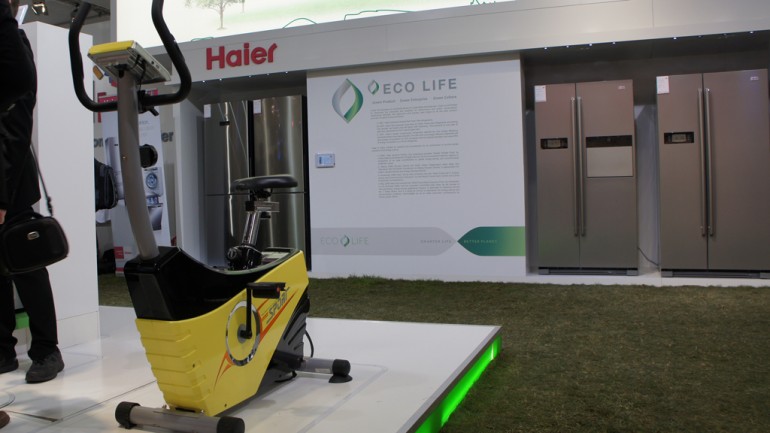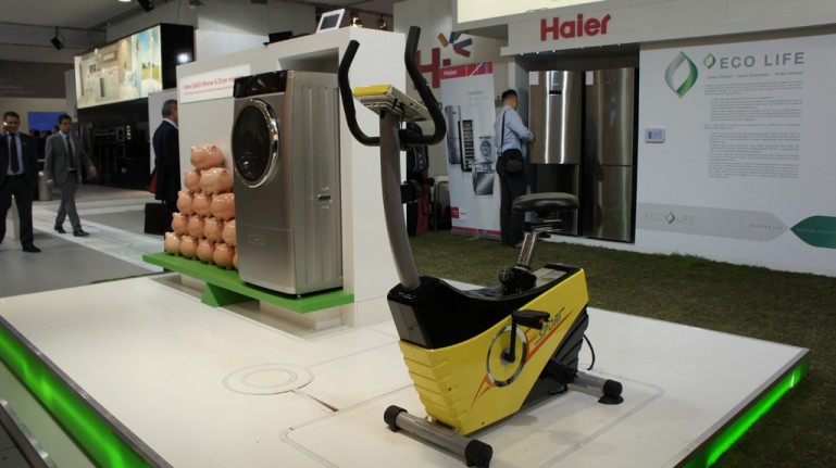 Der Chinesische Elektronik-Hersteller Haier hat auf der IFA 2010 eine Waschmaschine vorgestellt, die von einem Akku angetrieben werden kann, der wiederum mit Hilfe eines Heimtrainers aufgeladen wird. Durch kräftiges „in-die-pedale-treten“ wird ein lithium-Ionen-Akku gespeist, der die Waschmaschine mit Strom versorgt. 20 Minuten Radeln reichen aus für einen Kalt-Waschgang! Wenn der Akku nicht genügen sollte, greift die Maschine automatisch auf einen Stromanschluss zurück. Die Wäsche muss also nicht halbgewaschen in der Trommel liegen bleiben. Noch handelt es sich um einen Prototypen, der aber für mehr Bewusstsein im Umgang mit Haushaltsgeräten sorgen kann.