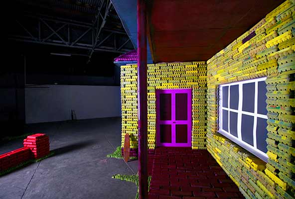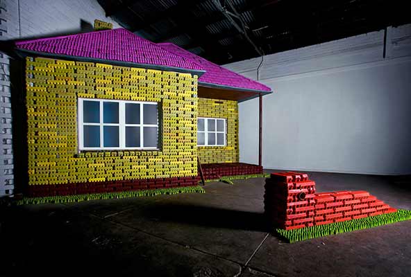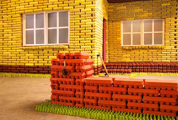 Passender könnte ein Beitrag nicht sein. Parallel zum Dioxin-Skandal ist diese farbenfrohe Arbeit von Goldenhen aus Australien in unseren Posteingang geflattert. Ob sich nun Rückstände des Dioxins auch in den Eierkartons befinden, ist aber fraglich. Wie Lego-Steine wurden die Kartons übereinander gestapelt und zu einem typischen Landhaus verbaut. In Deutschland werden jährlich etwa 10 Milliarden Eier produziert. Davon werden 50 % von privaten Haushalten verbraucht, 30 % in der lebensmittelverarbeitenden Industrie und 20 % in Großküchen und Bäckereien (Quelle: Wikipedia). Vermutlich landen 90% der Kartons nach jedem Einkauf im Altpapier und werden nicht für den nächsten Einkauf genutzt, oder für den Hausbau ;)