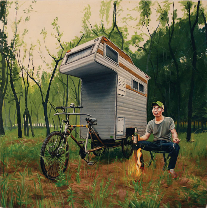 Der Künstler Kevin Cyr baute dieses Pedal-getriebene Wohnmobil. Das Model mit drei Rädern stammt bereits aus dem Jahr 2008 und diente außerdem für eine Reihe von Zeichnungen und Malereien. Für eine kommende Ausstellung entstand dieser luxuriöse Anhänger. Ein Gefühl von Freiheit und Unabhängigkeit durch Flexibilität und Mobilität dank eigener Muskelkraft.