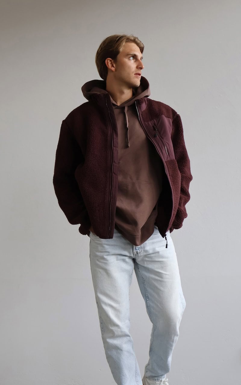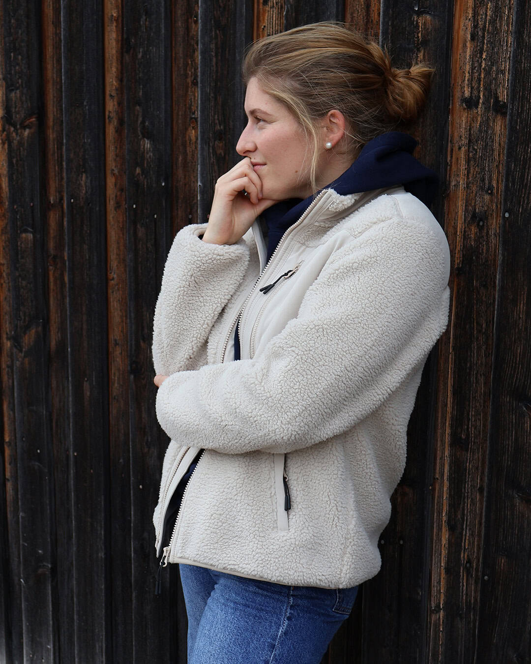Traditionell erinnert Sherpa-Fleece an Schaffell oder Loden, ohne deren Gewicht oder Pflegeaufwand. Das Material ist weich, anschmiegsam und erstaunlich funktional: Es speichert Wärme, trocknet schnell und ist zugleich robust genug für den Alltag. Seine wachsende Popularität erklärt sich aus der Sehnsucht nach Kleidung, die uns einhüllt und schützt, aber dennoch leicht bleibt. Sherpa steht so für eine sanfte Ästhetik, die Natürlichkeit und Komfort verbindet.