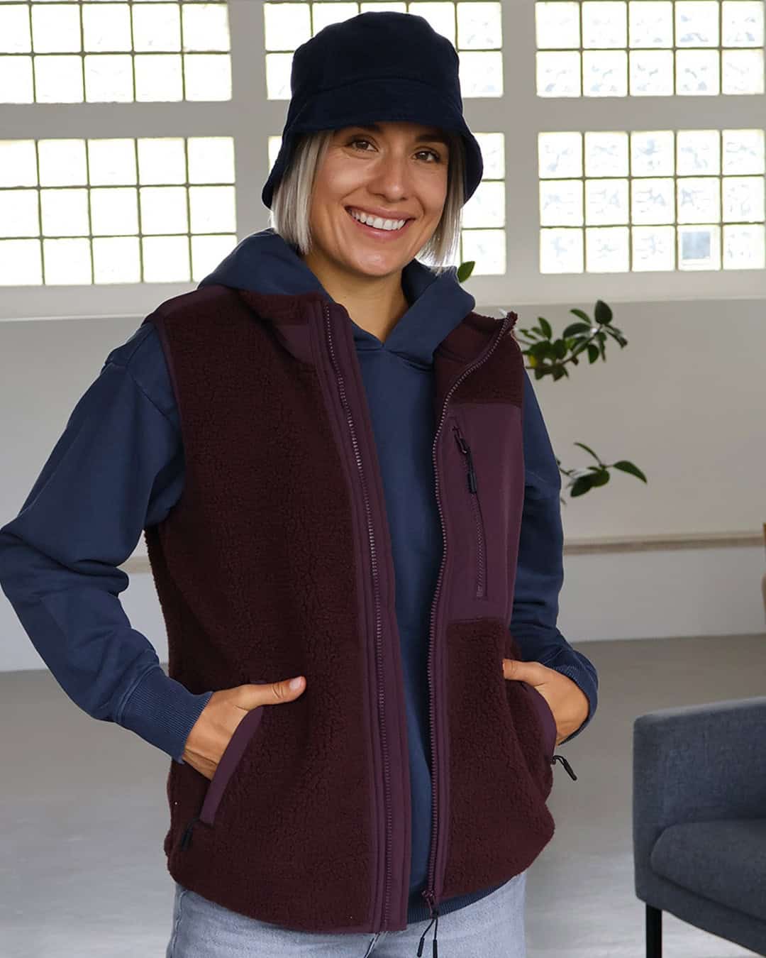 Der Sherpa-Fleece ist weich, federleicht und pflegeleicht. Er trocknet schnell, hält warm und macht die Jacke oder Weste zu einem unkomplizierten Begleiter durch die kalte Jahreszeit. Zwei Brusttaschen und Eingrifftaschen nehmen Schlüssel oder Kleingeld auf, ohne dass Taschenbeulen entstehen. Die Sherpa-Teile sind vegan: kuschelig warm, aber ganz ohne Wolle.