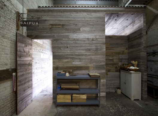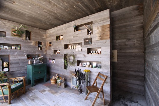 Auftraggeber war ein kleines Familienunternehmen mit Namen „Saipua“, welches vor allem handgemachte Seifen und einzigartige Blumenarrangements herstellt und vertreibt. Im Zuge einer Vergrößerung ihres Geschäftes suchten die Betreiber nach einer Lokalität, die genug Platz für einen Produktions- als auch Verkaufsraum bieten, aber dennoch die Identität Ihres Ladenkonzeptes wahren konnte. Gefunden haben Sie ein bestehendes Warenhaus, in das der Laden einfach „eingeschoben“ wurde. Das unbehandelte, rauhe Holz mit grauer Patina verleiht dem Laden eine einfache, aber ehrliche und irgendwie auch familiäre Atmosphäre, die unweigerlich eine Art „persönliche Beziehung“ mit dem Besucher aufbaut. Ein Konzept mit Herz und ganz viel Charme.