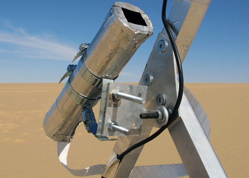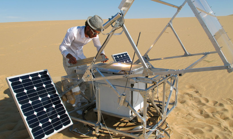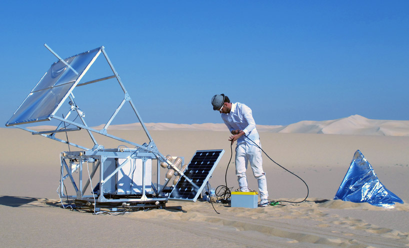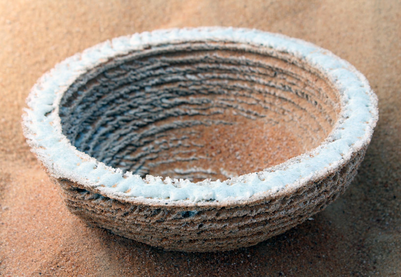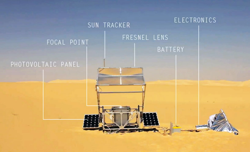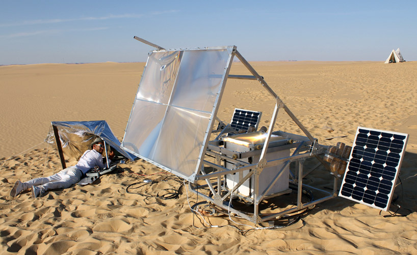 Der Design-Student des Royal College of Art (London) Markus Kayser hat eine Maschine mit dem Namen Solar-Sinter entwickelt. Der vollautomatische,solarbetriebene 3D-Drucker wandelt Sonnenlicht und Sand in Glasprodukte. Genau wie herkömmliche 3D-Drucker arbeitet auch Solar-Sinter mit dem Schmelzpunkt eines Pulvers (in diesem Fall Quarzsand der Sahara) um es in Form zu bringen und anschließend in der gewünschten Form wieder erhärten zu lassen. Das Gerät bewegt sich automatisch und positioniert sich in der richtigen Position zur Sonne. Durch kontinuierlich neu aufgetragene Schichten von frischem Sand, entstehen 3-dimensionale Produkt aus Glas.