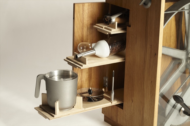 Eine gute Entscheidung war es, die Antriebsmechanik nicht in die Geräte selbst zu integrieren, sondern mit dem Schwungrad konsequent auszulagern. So werden die Anschlussgeräte wesentlich kleiner, leichter und sind vielseitiger zu nutzen. Gleichzeitig ist die Mechanik so weniger anfällig und sicherlich auch besser zu reparieren. Der Gedanke einer zentralisierten Antriebseinheit für alle Haushaltsgeräte ist anregend und Christoph Thetard denkt selbst schon über eine kleinere Badversion mit Anschluss für Rasierer und rotierender Zahnbürste nach.