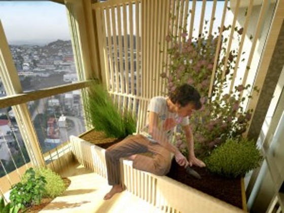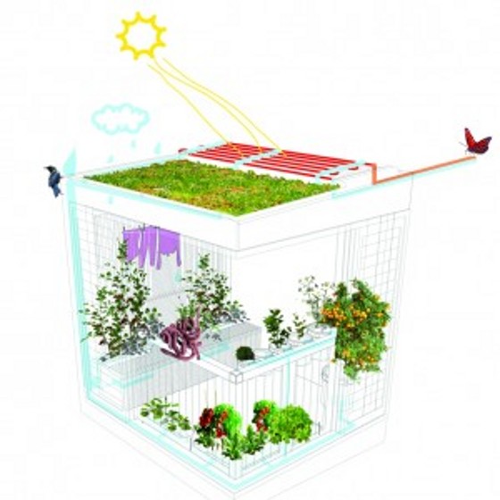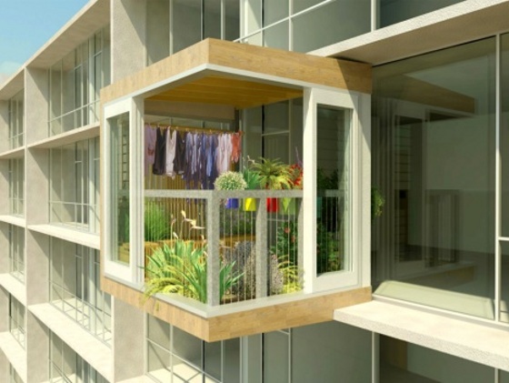 Der Australier Tim Gittos, seines Zeichens Architekt, hatte die zündende Idee. Seine Hausgärten lassen sich einfach an balkonlose Häuser andocken und bieten so den Bewohnern zusätzlichem Raum und Platz für einen kleinen Stadt-Garten. Gerade bei Bauten mit einer großflächigen Glasfassade dient der Vorbau als ideales Verschattungselement zur Vermeidung von sommerlichem Wärmestau in der Wohnung. Im Winter funktioniert der Raum, ähnlich wie ein konventioneller, unbeheizter Wintergarten auch, als sogenannte Pufferzone, in der sich die kalte Außenluft erwärmen kann und dann erst an das Innere der Wohnung abgegeben wird. Zusätzlich ausgestattet mit einem Gründach und Regenwassersammeltank sowie einem Warmwasserkollektor, trägt das Konzept auf diese Weise effektiv zur Senkung des Energieverbrauchs bei.