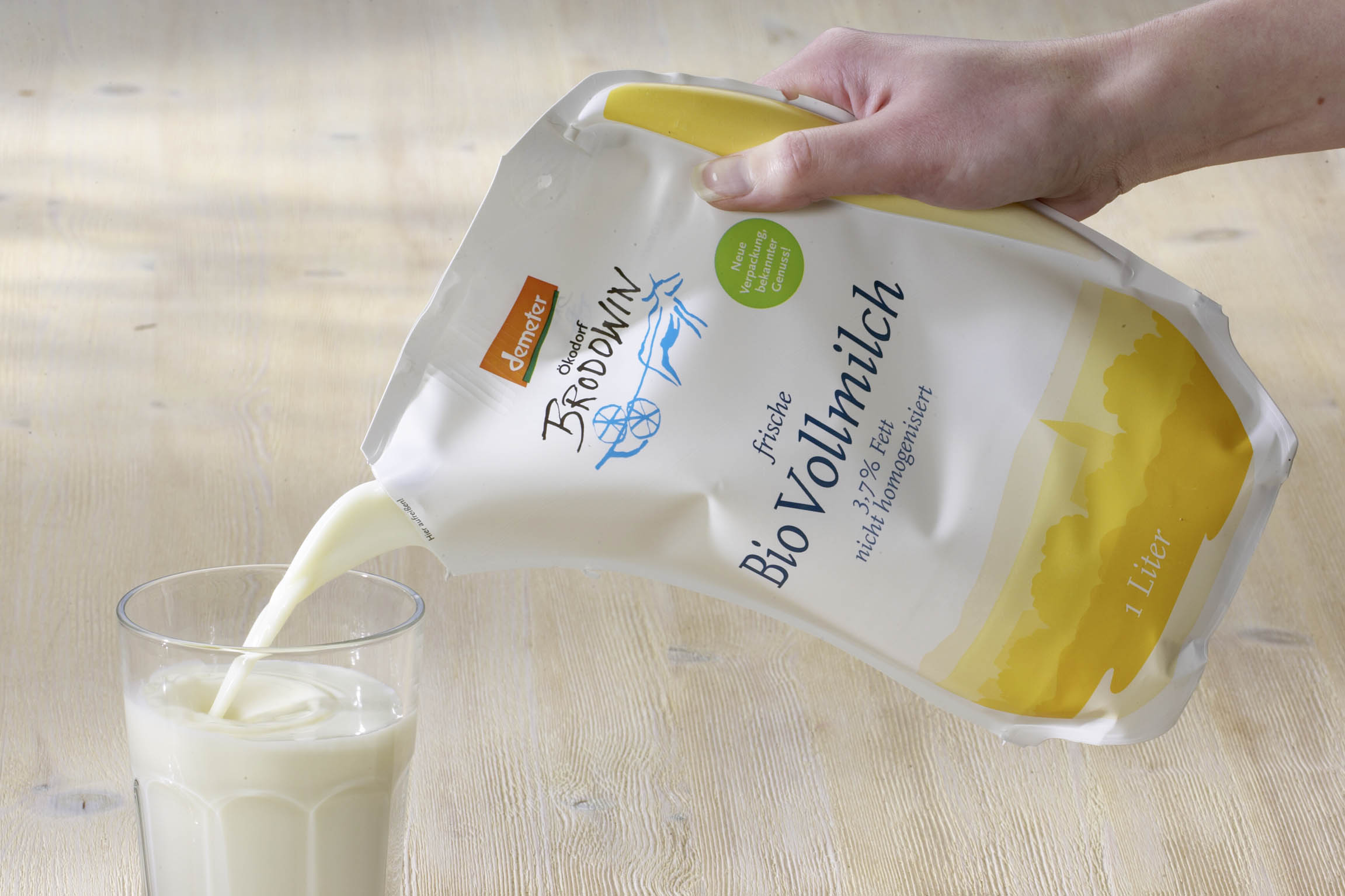 Deshalb finden wir den Standbeutel auch in den Sortimenten von Öko-Molkereien wie beispielsweise dem Ökodorf Brodowin, die 2007 den Ecolean Standbeutel einführten. Ecolean ist ein schwedisches Unternehmen, das das Folienmaterial Calymer entwickelt hat, das zu 40% aus natürlich vorkommender Kreide besteht und zu 60% aus recyclebarem Kunststoff besteht. 16 Gramm bringt der Beutel lediglich auf die Waage, entsprechend günstig fällt der ökologische Fußabdruck des Produktes im Vergleich mit Glaspfand, Tetrapaks und Kunstoffflaschen aus. Zur besseren Handhabung hat der Beutel einen stabilisierenden Griff der aus Luft aufgeblasen wird. Einziges Manko ist die fehlende Wiederverschließbarkeit und das vielleicht etwas gewöhnungsbedürftige Format. Der Standbeutel mit aufgeblasenem Griff soll in der Silhouette an eine Karaffe erinnern, kann aber als eines der meistkonsumierten Alltagsprodukte hier die Erinnerung an heimelige und vertraute Formen nicht herstellen. Und im normalen Alltag greifen die meisten Konsumenten zu dem was ihnen am bekanntesten ist.