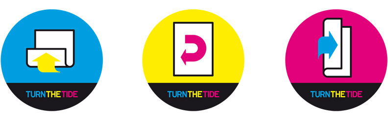 Tobias Battenberg und Marcel Kamps entwickelten an der Kölner ‚ecosign‘-Akademie das Projekt „Turn the Tide – Wende das Blatt“. Mit Hilfe ihrer Website kann man in nur fünf Arbeitsschritten die richtige Wendemethode des jeweiligen Druckers herausfinden. Als Ergebnis kann man für seinen jeweiligen Druckertyp einen von Drei Stickern mit einem erklärenden Piktogramm bestellen. Eine wirklich nachhaltige Erleichterung dieses kleinen Alltagsproblems.