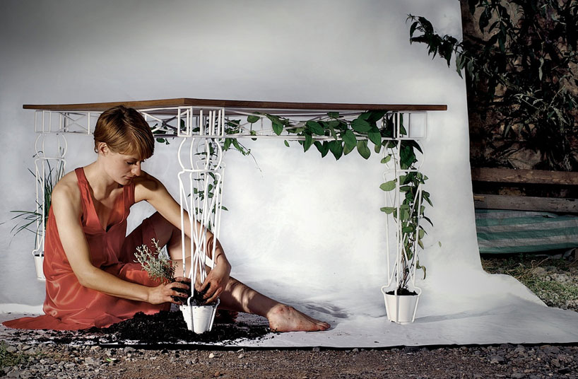 Je dichter ein Gebiet besiedelt ist, desto seltener werden horizontale Grünflächen. Damit nicht auf das so wichtige Grün verzichtet werden muss, lassen sich dank des vertical gardening Hauswände und Fassaden begrünen. Doch auch im Innenraum hat das vertical gardening viel Potenzial, wie der Tisch von studio jailmake eindrucksvoll unter Beweis stellt. Jedes der vier Beine dient als Topf und Rank-Gerüst für unterschiedliche Pflanzen. Mit Tomaten, Bohnen, Erbsen und anderen Kletterpflanzen kann so direkt vom Tisch(-Bein) in den Mund gespeist werden. Die Beine sowie die Eichenplatte stammen aus England und werden von jailmake in Handarbeit gebogen.