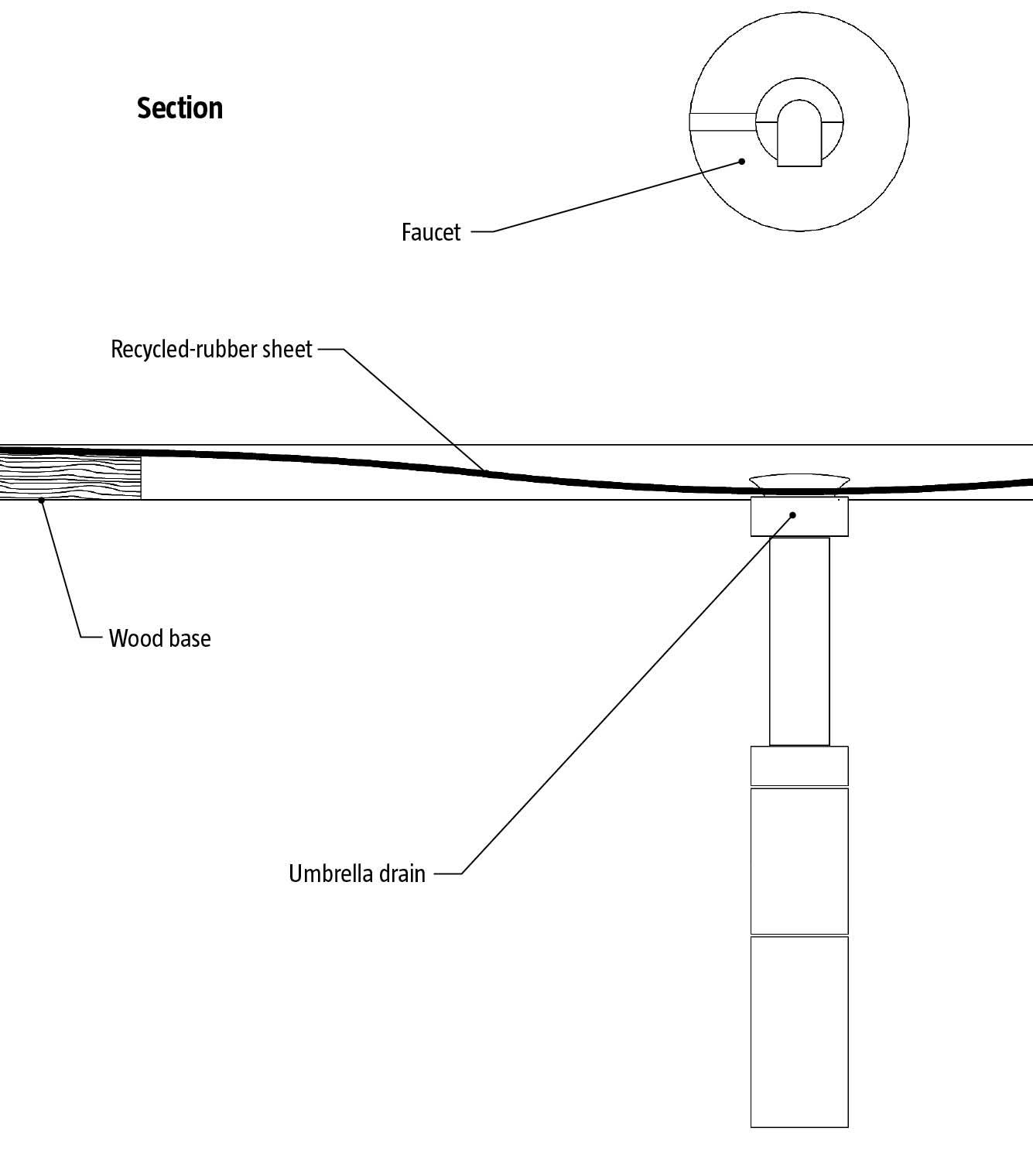 Das Gummi wird eingeschmolzen und von Verunreinigungen befreit. Die kleinen Metallfasern, die dem Reifen seine Stabilität geben, ermöglichen so das dünne Gummiwaschbecken. Das Gummi wird anschließend über einen Rahmen gespannt und mit einem Abfluss versehen.