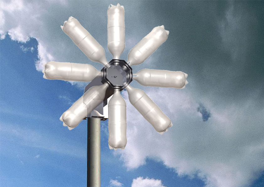 Eine Vorliebe von Tjeerd Veenhoven ist es mit unterschiedlichsten Materialien und Produktionstechniken zu experimentieren. Bei der BottleWindmill hat er sich der Aufgabe gestellt, wie nur mit dem Einsatz von Lowtech-Lösungen aber mit verfügbarem Hightech-Wissen Wind-Energie erzeugt werden kann. Als Hauptmaterial kommen PET-Flaschen zum Einsatz, die als „Rotorblätter“ fungieren und mit dem Schraubverschluss angebracht werden, ohne eingeschmolzen werden zu müssen. Zur Energieerzeugung werden elektrische Bauteile von Kinderspielzeug verwendet. Bei einer geschätzten Auflage von 5000 Stück kann die BottleWindmill zu einem Preis von 10 $ hergestellt werden. Das finale Produkt zeichnet sich durch eine ökologisch effiziente Fertigung aus, was wiederum durch den reduzierten Einsatz von Materialien und die Möglichkeit einer vollständigen Trennung nach Ende des Lebenszyklus auszeichnet.